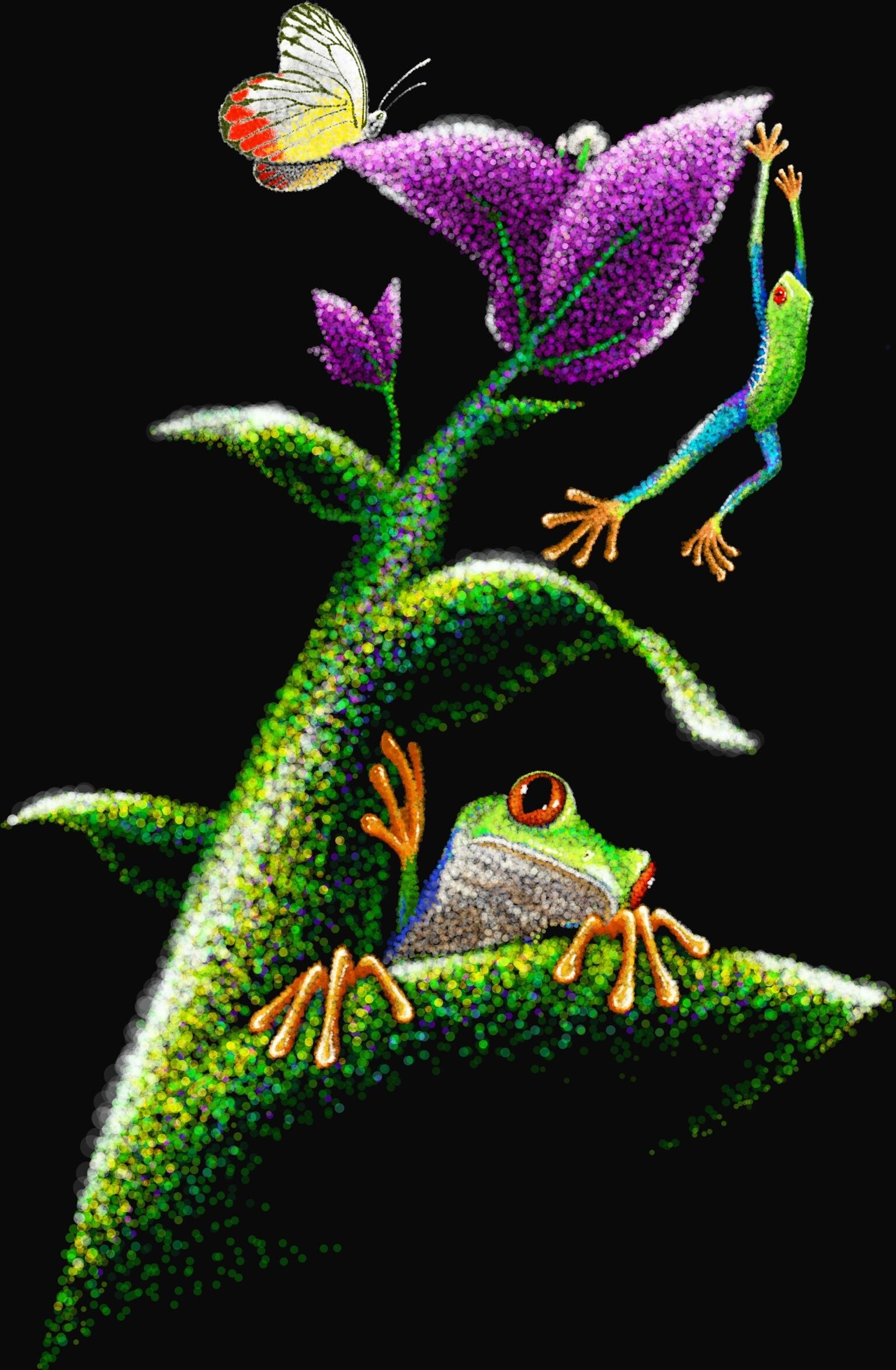 カラーの点描画でアカメアマガエルと